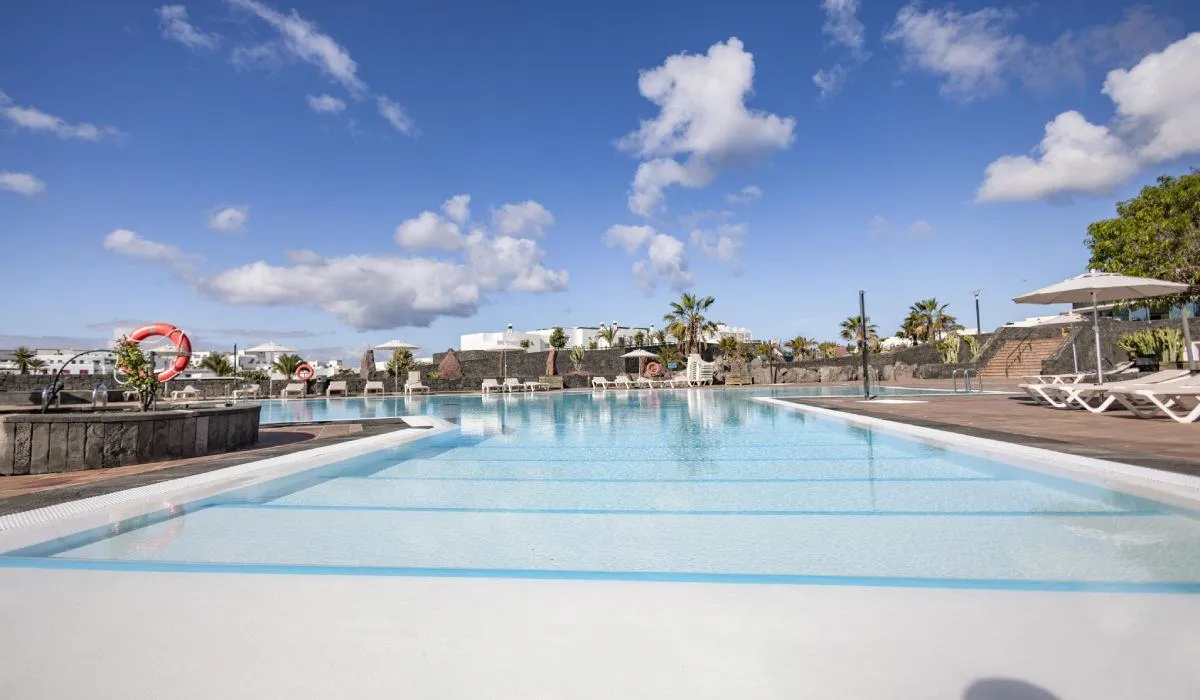 Komplekset har et stort utendørsbasseng, sammen med et solarium med solsenger og parasoller.