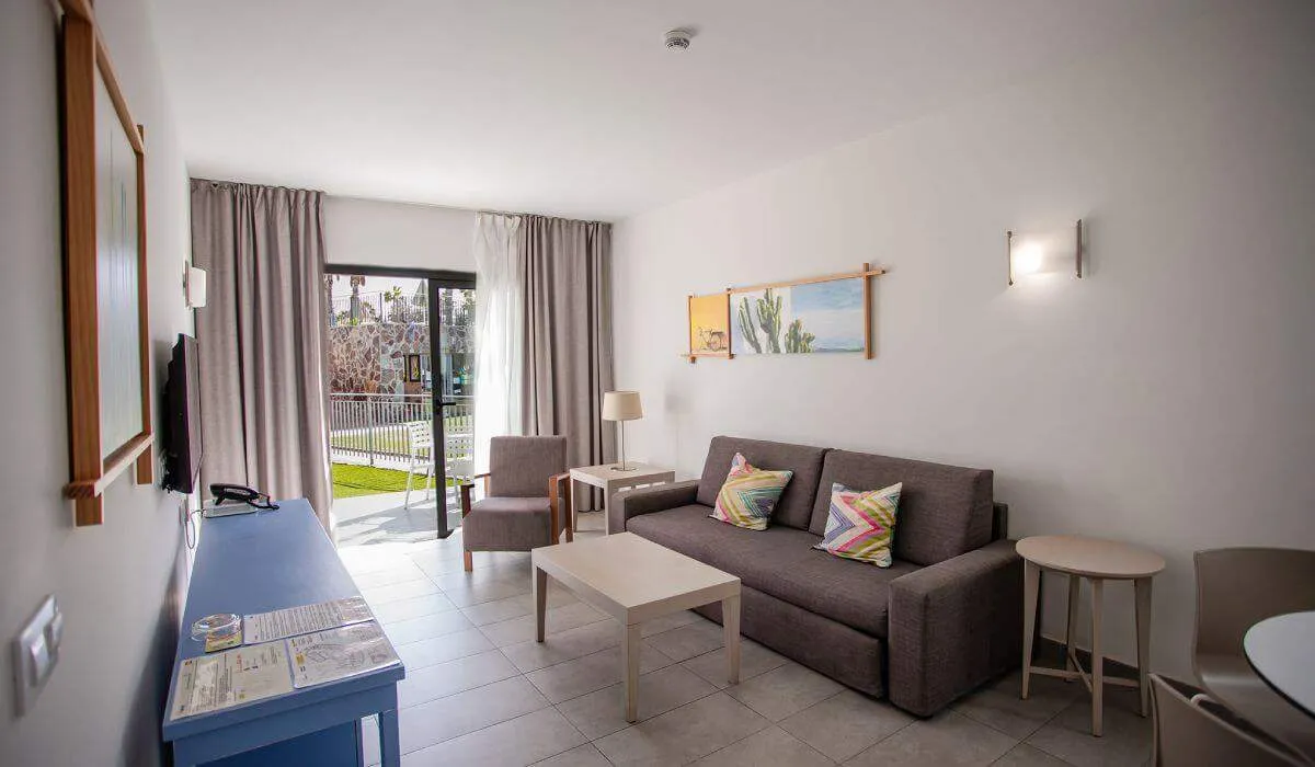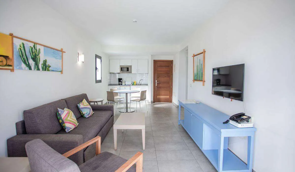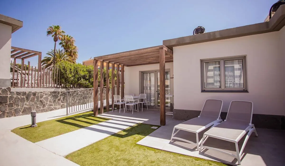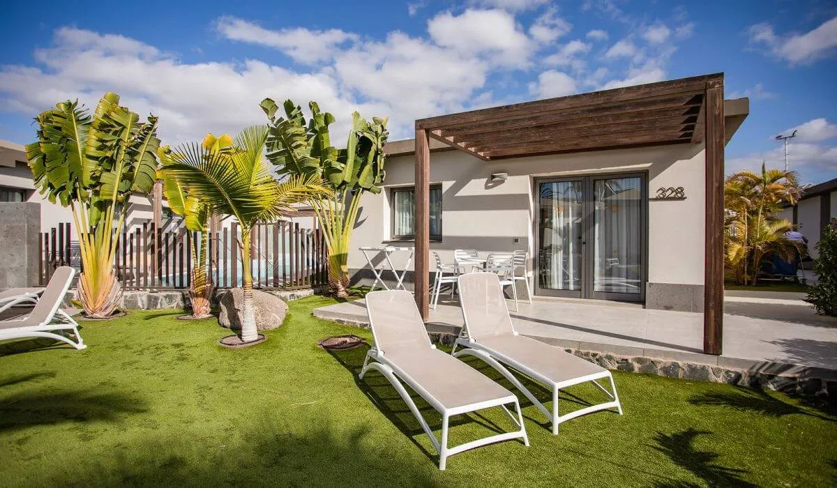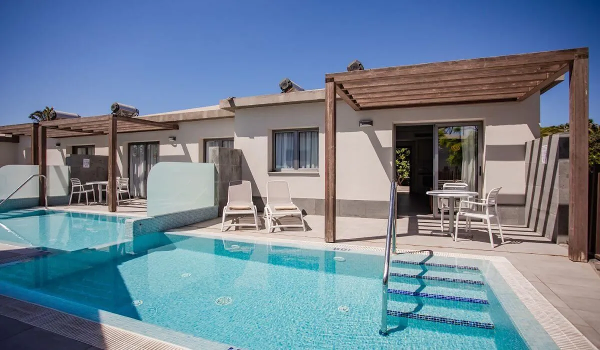 Den ensoveroms Bungalow Premium med tilgang til bassenget er dekorert med design og sjarm. Fordelt på et areal på 77,50m2, har den alle bekvemmeligheter slik at du kan nyte en unik opplevelse under ferien. Lys, komfortabel og romslig vil du finne et soverom med to enkeltsenger sammen, et fullt utstyrt kjøkken hvor du kan lage mat komfortabelt hvis du ønsker det, et romslig bad med dusj, en koselig stue med sovesofa, TV, telefon, gratis WIFI og aircondition. Med en romslig terrasse fullt møblert og solsenger, på en utmerket beliggenhet i komplekset, vil du også ha en privat basseng for å oppnå maksimal avslapning.